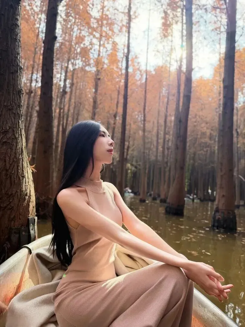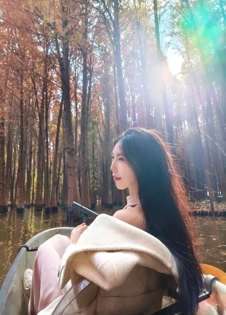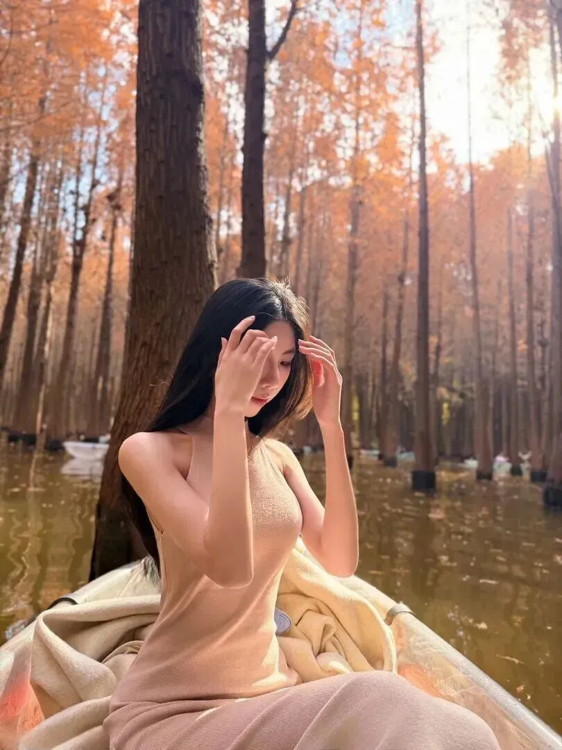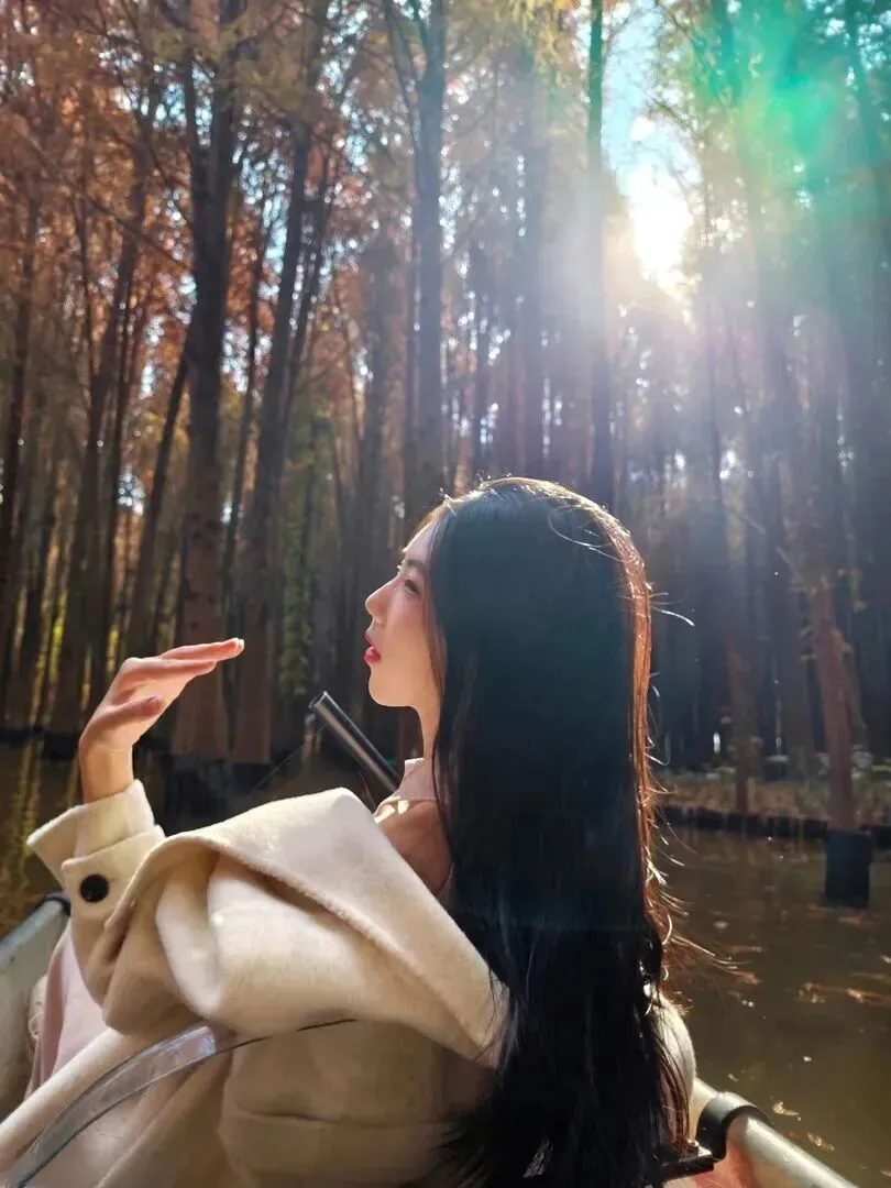 选在水上森林拍照太聪明了。树林有纵深,水面反着光,小船慢慢摇晃着。她往那儿一坐,便成了森林的一部分。场景与人不可分割才能称为最好的搭配。