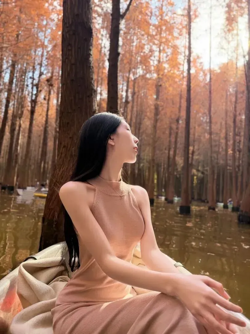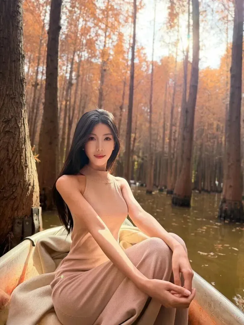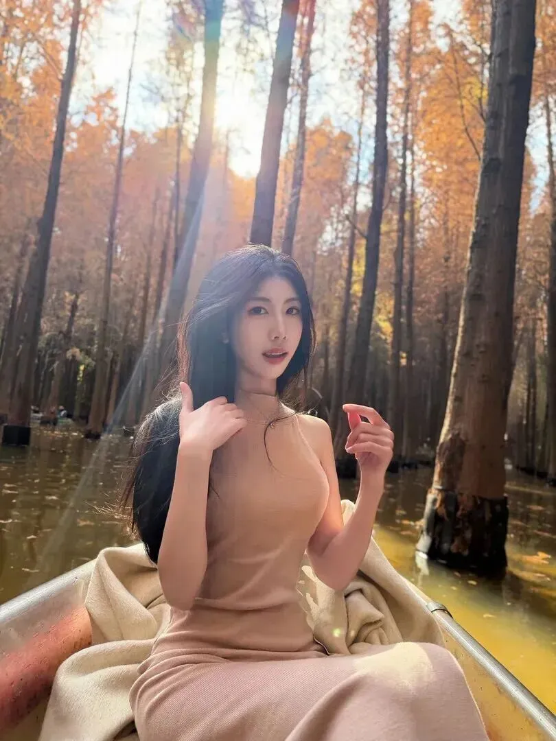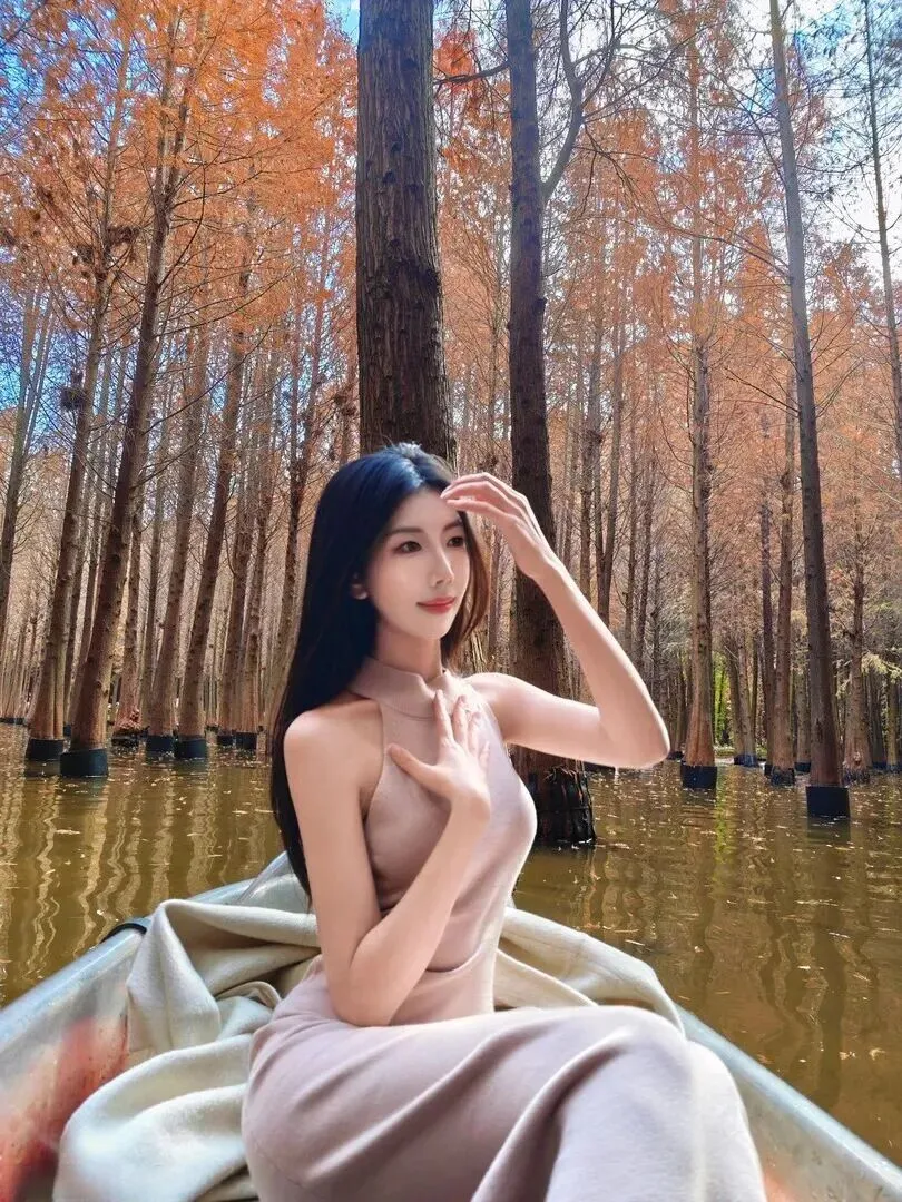 选在水上森林拍照太聪明了。树林有纵深,水面反着光,小船慢慢摇晃着。她往那儿一坐,便成了森林的一部分。场景与人不可分割才能称为最好的搭配。