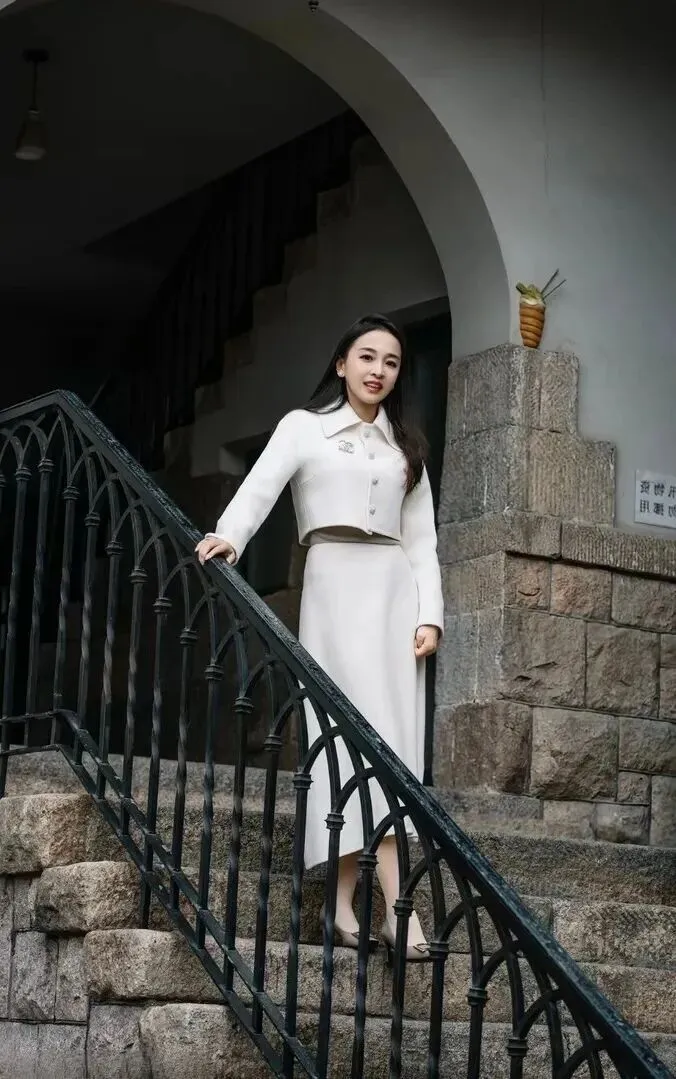 先讲约会穿搭。白色毛呢套装简直是美得令人窒息,短款翻领外套和高腰半身裙一起使用,马上就把腰线暴露无遗,并且有着庄重的质感和韵味。姐姐有一头很长的卷发,一笑就端庄娴静如老电影中大小姐一般。她轻轻靠在黑色铁艺楼梯上,整个人从容的很。脚上浅灰色尖头细高跟、肉色丝袜,腿长一米五以上。老建筑里拍照,复古气息弥漫,谁看了都不糊涂。