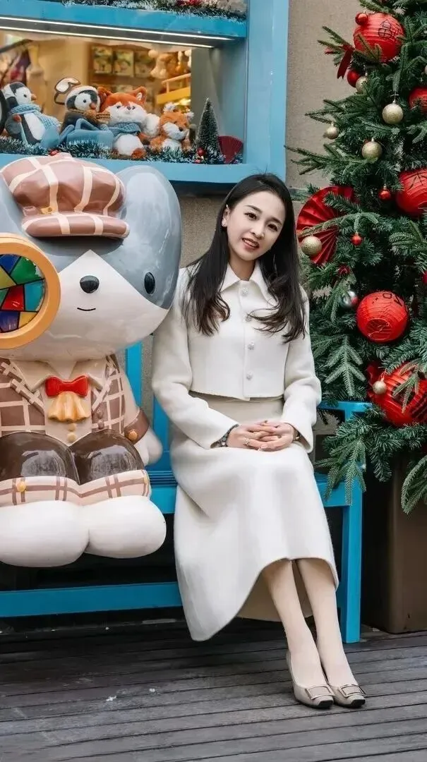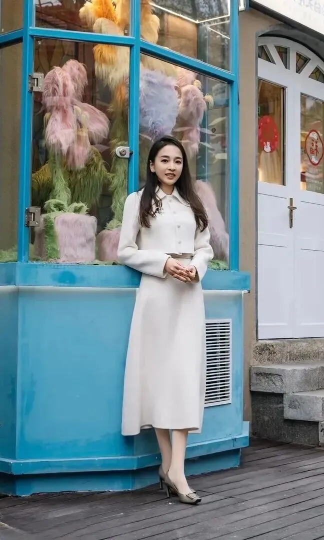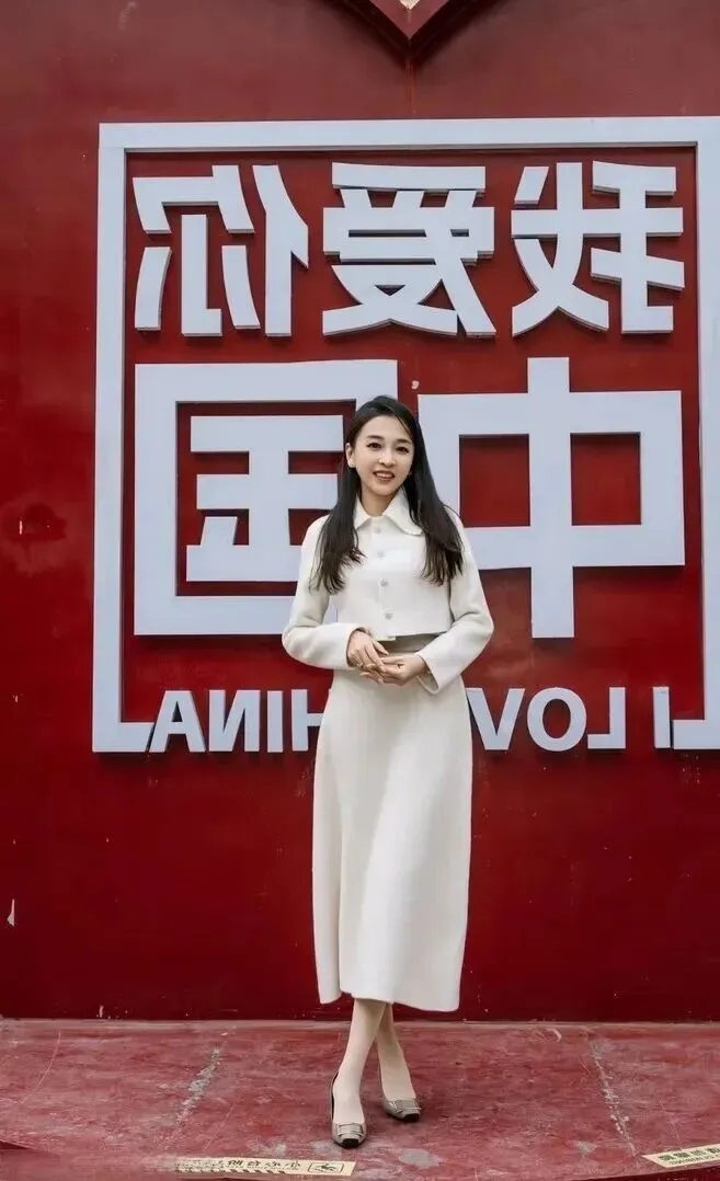 节日场合要穿得端庄一些。米色毛呢套装长裙更显沉稳。浅灰色低跟鞋带的金属装饰很细致。站在红色的历史背景之下,妹妹甜甜这样说道“我爱你中国”使节日更加地富有喜庆的味道。春节穿这套装扮符合身份且得体,长辈们都夸奖她打扮好气色不错。