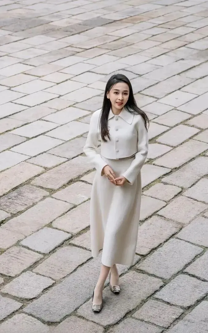通勤穿搭要讲究得体。米色双面呢短外套穿在上面同中长裙套装一起,既有职业的气息又有一种特有的女性气息。方扣低跟单鞋走路稳定。姐姐走复古石板路的时候双手拢住自己,脸上带着甜甜的笑,活像位工作得很好的职场小姐。穿上它上班既得体又有时尚感,同事们问起它的链接。