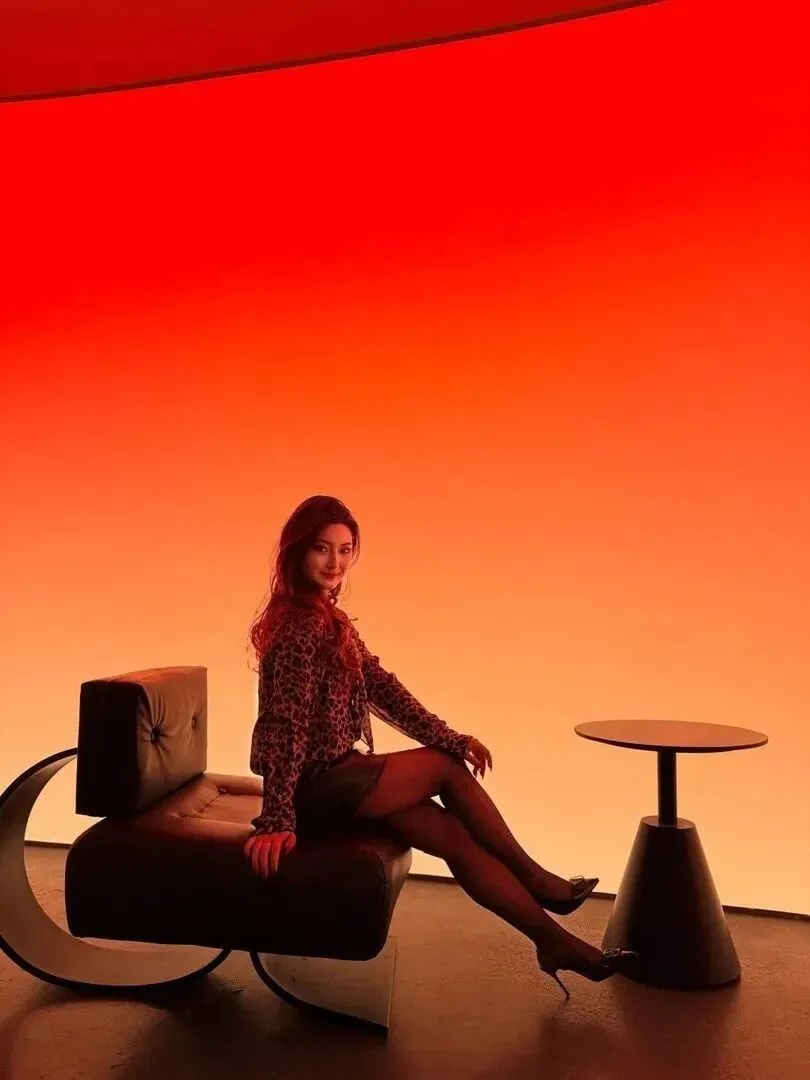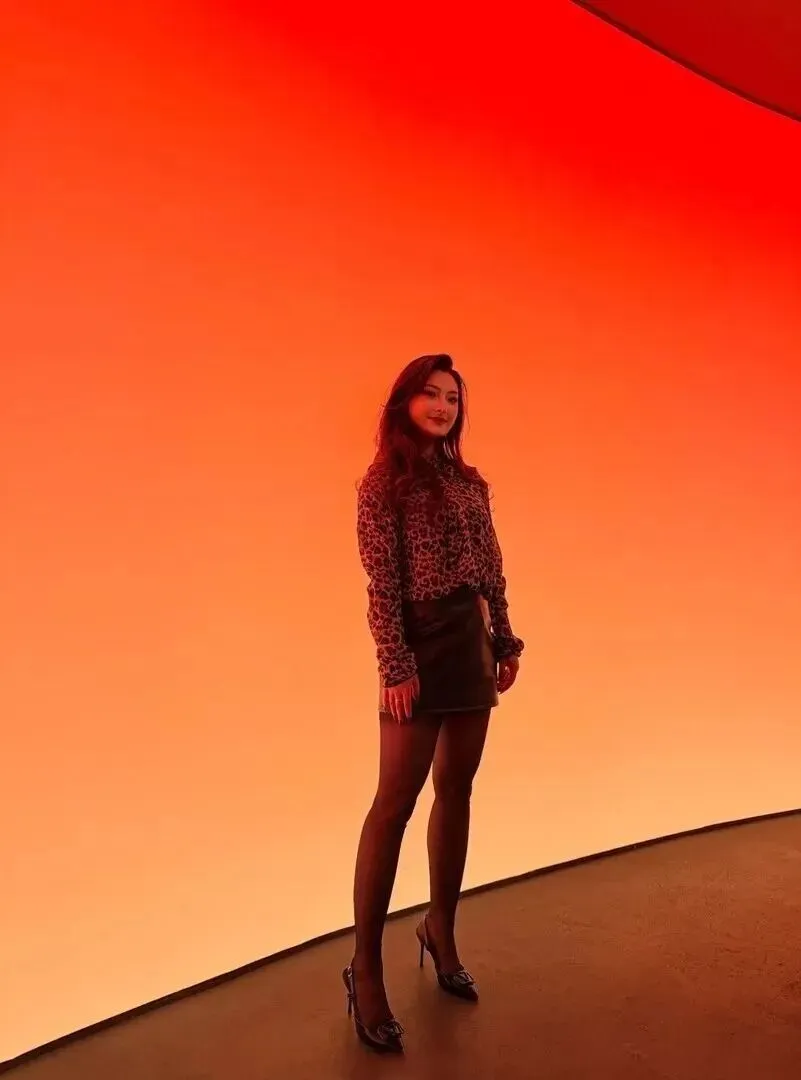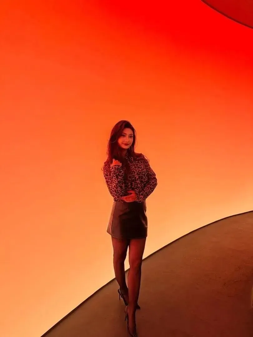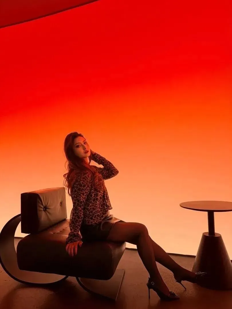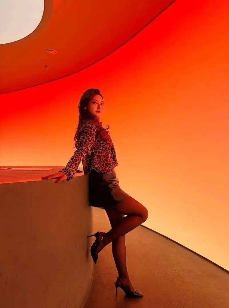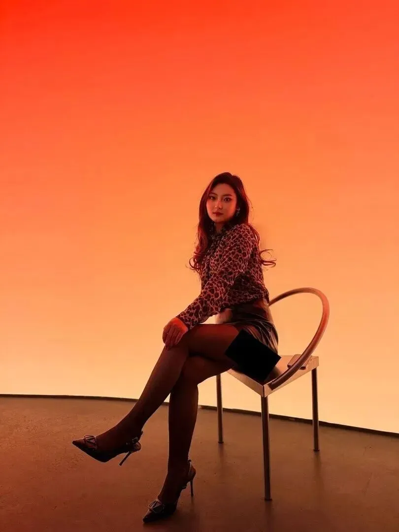 依靠弧形台面这张,穿搭的实用性非常高啊!两腿一前一后,很有活力。豹纹在暖光下泛柔光,皮裙却成了哑光的,材质一搭配高级死了。这样的“随便一站就好看”的自信,谁不想学呢?