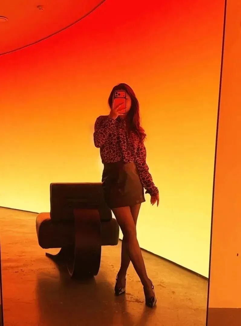 对镜自拍超真实,脸被遮挡的时候又带来了放松的持机感觉,仿佛就是在日常生活中的穿搭打卡一样。镜面反射多角度,豹纹+皮裙+高跟鞋的搭配证明,这身衣服是真正在外面走动时可以使用的。