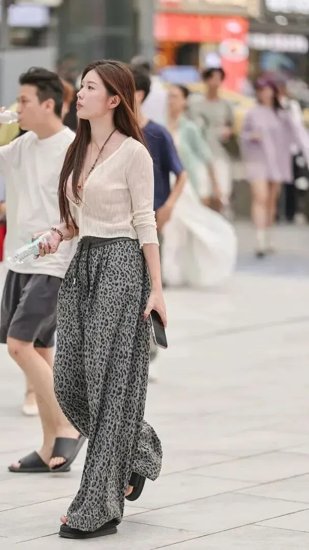 慵懒松弛感接下来会进行论述。穿上很合身,又时尚。米白色针织开衫具有实用性同时有随意感。穿上一件浅色内衬,小性感就出来了。裤子是灰底黑纹的豹纹阔腿裤,不会太过夸张,却打破了单调。脚上是高跟拖鞋,走路不累脚。他整个身体看上去很懒惰,但是很时尚。她带着矿泉水瓶、手机走下楼的时候,看上去是随意的,但是处处有小心。