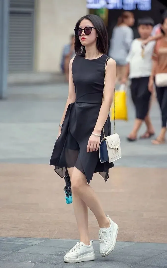 暗黑酷飒风套组有很强的超大气场。全身黑色无袖连衣裙,上身紧身,有身材。裙摆是透明薄纱主要的部分,不规则的形状灵巧灵动。背个白蓝色的小方包,一下子就亮了整体。白色厚底休闲鞋舒适有时尚感。戴一副大墨镜像城市里神秘的女郎,又酷又美。