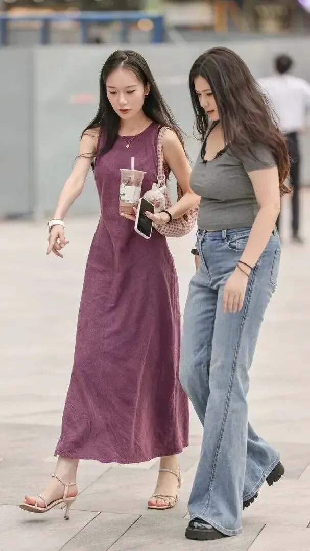 闺蜜日常风指闺蜜出行穿轻便的有美感的时尚穿搭,并不是奢靡风。左边的少女穿的是深紫色的上衣、浅粉色的凉鞋,带着羞花带娇的温柔色彩是她气质的最好表现。包上了白色兔子玩偶,显得更加可爱。右边的那个女郎穿的是灰短上衣配蓝色喇叭裤这种比较百搭的衣服搭配方式。厚底鞋增高显瘦,走路不累。个人的安静和活泼在一起和谐又养眼。