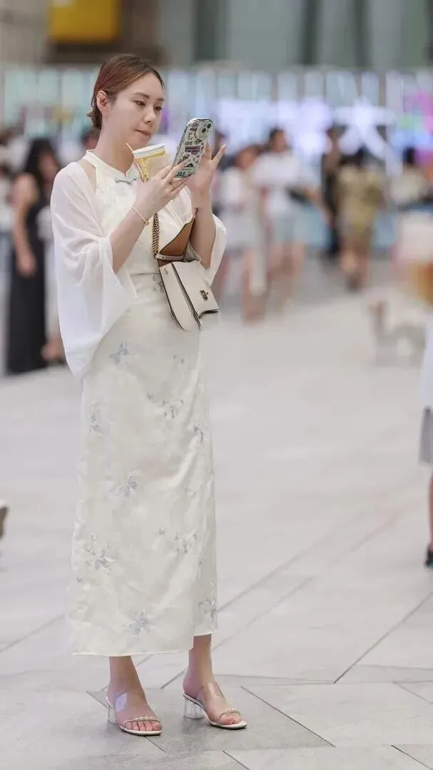 温柔国风是把中式美学与之融合在一起的。白色长袖旗袍上绣着蓝色的蝴蝶、星星等,极富设计感,很美很浪漫。蓝色盘扣设计带有古典的意味。外套是白色的薄纱开衫,非常仙气飘飘。透明高跟凉鞋拉长腿线。斜挎白色的皮质链条包很耐看。街上游览一遍后,回头率很高。