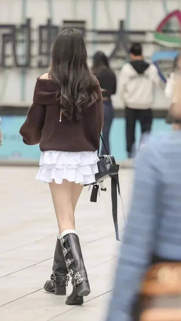 背对镜头的女生就属于法式的优雅,是复古法式风。深棕色露肩针织毛衣,很温柔又很性感。白色多层荷叶边短裙非常可爱。黑色高筒靴加皮质单肩包,帅一个。长发飘扬,行走带风,引起人们的注意。