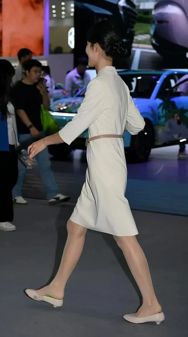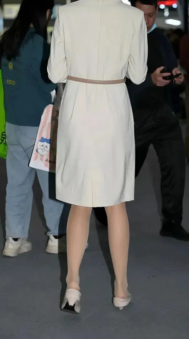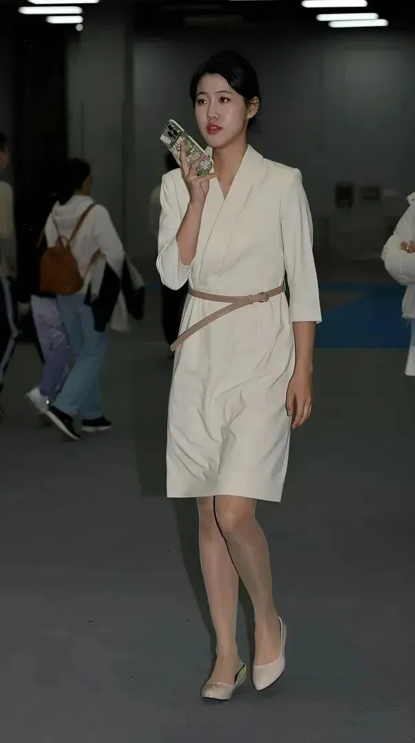 先来呈现一张背影图。小姐姐行走在大街上,身着米白色连衣裙线条整齐有条理的立领样式把她的脖颈显得格外苗条起来。腰带系得很宽,是淡棕色的细腰带,只展开了小蛮腰就能露出来。直筒收腰的版型可以藏肉显曲线,胖瘦均可穿着,适合所有体型的人群。