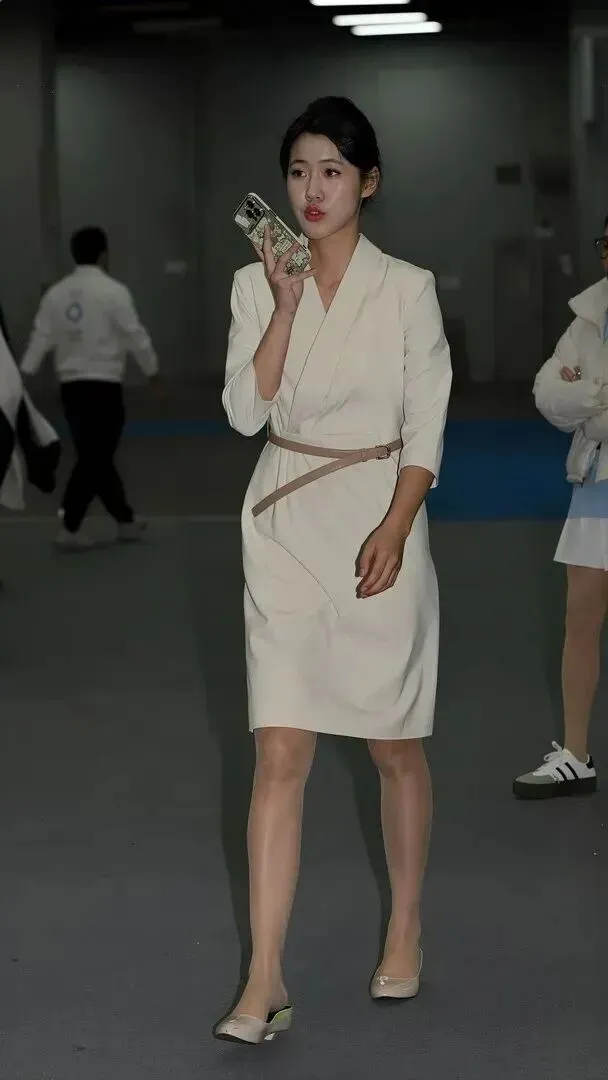 她的配饰做得很克制。不带有夸张的项链、手链等物品,很整洁、大方。有些时候少一点反而更有味道。