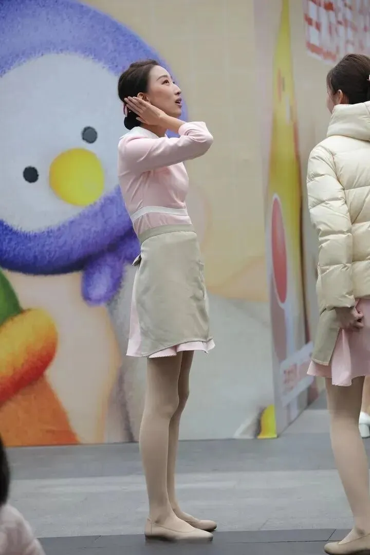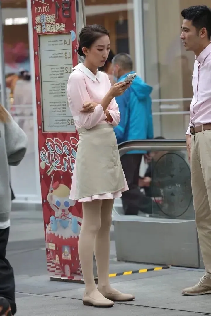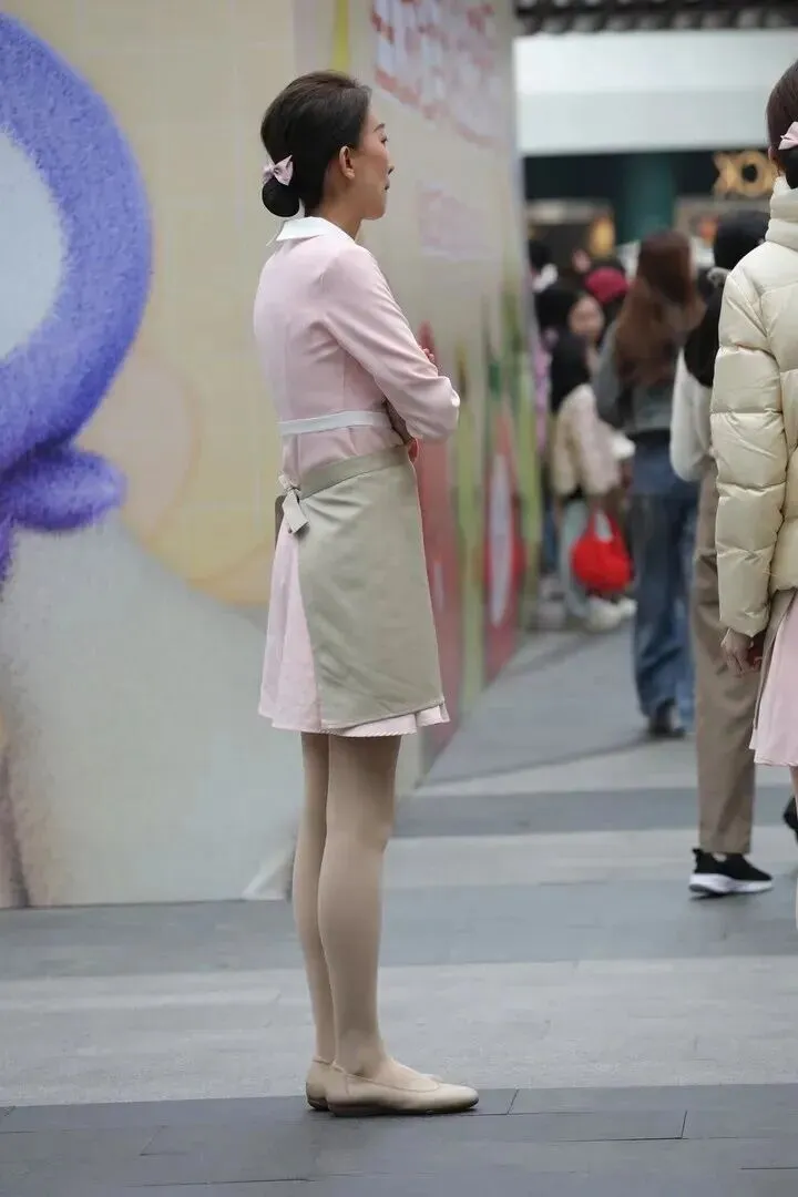 商场里这身偏通勤风格。浅粉色上衣加卡其色围裙很简约大方。简洁又不冗长。
