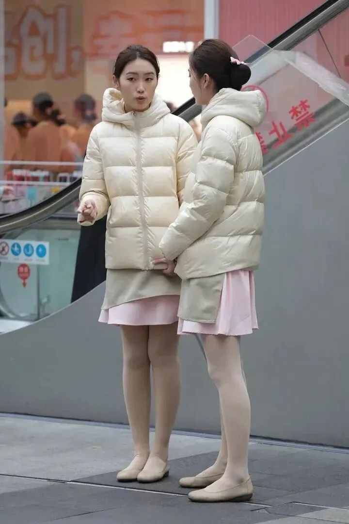 米白色羽绒服搭粉色短裙,厚重面料挡风。宽松设计活动方便。整体还停留在柔和的颜色上。