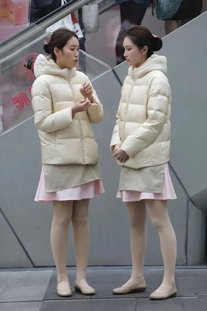 这两名女生的风格不一样。左边短发,米白色羽绒服,干练里透着温婉。右边女生的盘发加粉色发饰是甜美的,是甜美感。