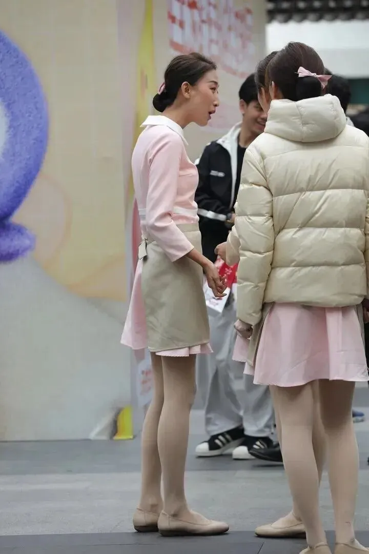 从图中左边女生穿着浅粉色连衣裙、搭配卡其色围裙可以知道。领口和腰上加点白色装饰,整体亮了起来。蝴蝶结给人少女感。中间以及右边的女生都是白色的羽绒服加上短裙。温和又不会过分地表现出更加的轻盈可爱。