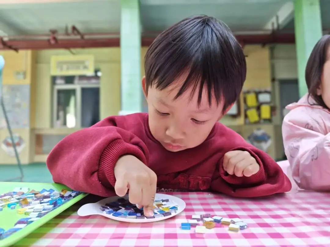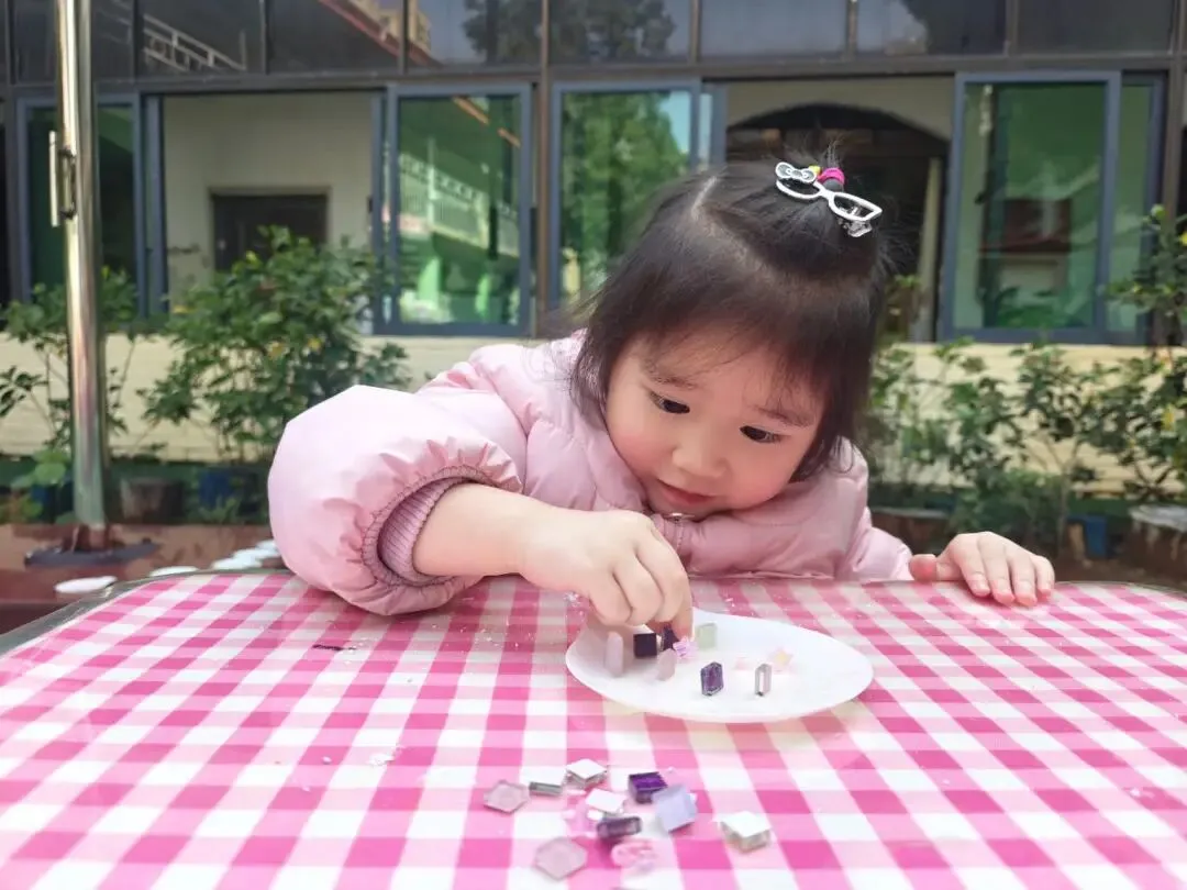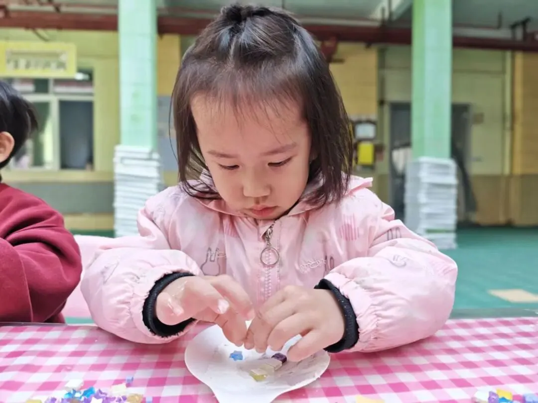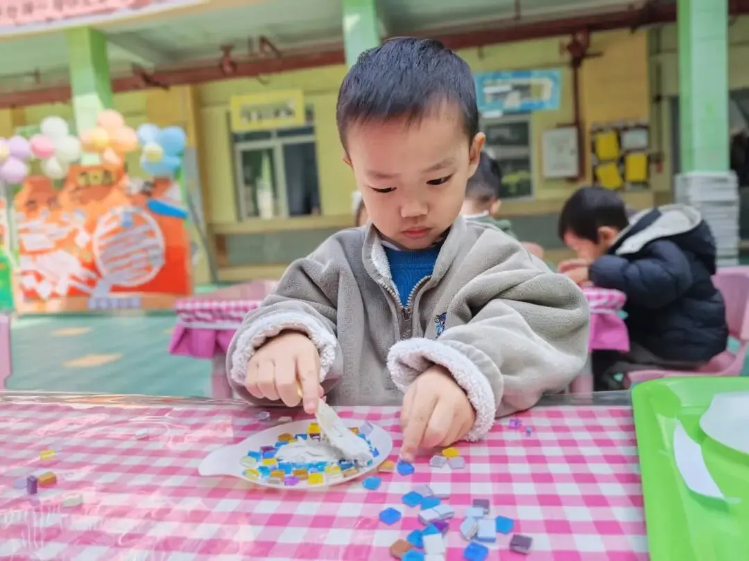 托、小班幼儿们用五彩马赛克片,亲手拼出小小的首饰盘。一块块色彩,是幼儿们最纯真的心意;一片片拼接,藏着满满的爱与祝福。小小的盘子,装得下温柔饰品,也盛得下稚拙又真诚的感恩。