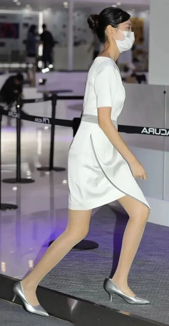 第一套衣服是用白裙子加上银灰色领子、腰部的服装搭配来组成的。高马尾给人一种非常精神的感觉,即使戴着口罩也掩不住那份专业的气场。穿的太正式不接地气、不合群、显老气,太朴素又太接地气,走路带风。