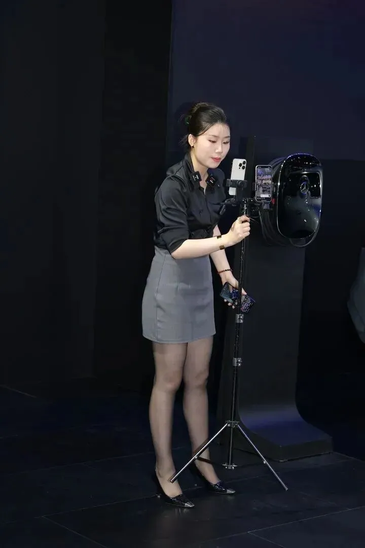 直播中间歇的时候她立刻调节设备。右手拿手机,左手稳三脚架,动作麻利得很。这专业程度一看就是老手。