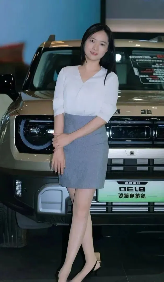 她站在浅金色的越野车前面,她就是车,车就是她,人被车融合。白底深灰的V领雪纺衫+浅灰的高腰一步裙,正式感满满,女气又出,美翻了!双脚交叉站立,左手抓胸前略微下沉的姿势不会引起行人在背后看她的现象。