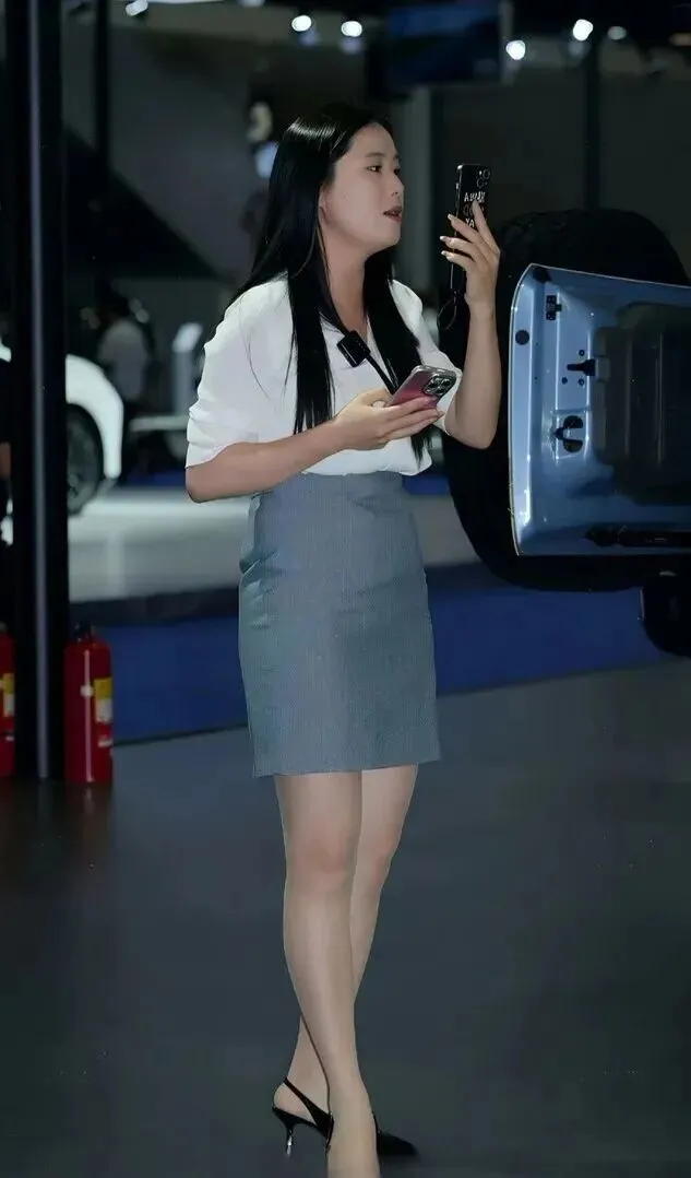 换成驾驶座以后,她又有了另外一种风格。米白色短袖衬衫与浅灰色修身短裙搭配的方式未有改变。脚上那双黑色细带凉鞋,鞋跟不高但是可以把腿型拉得特别修长。她斜倚在椅子上,闭眼享受着车展的气氛,车展对她是私人演出。