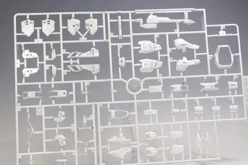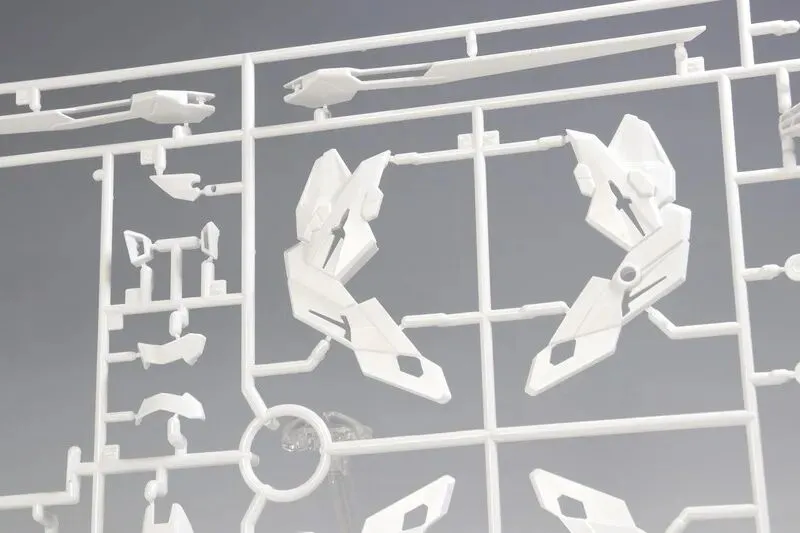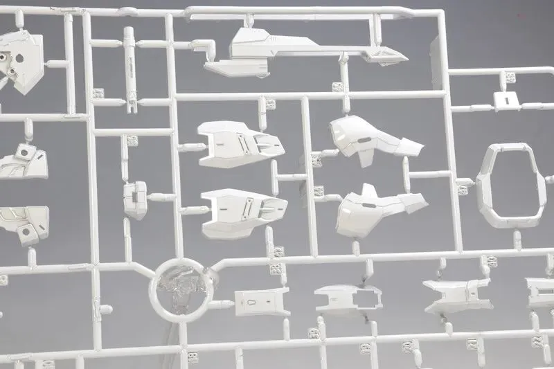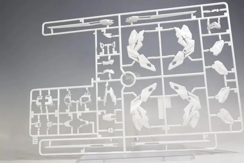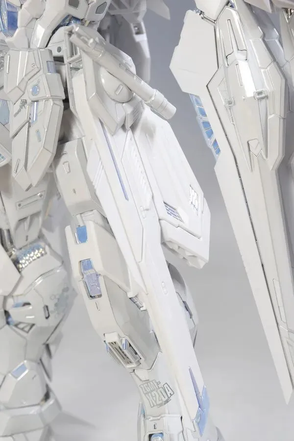 主体的色彩运用堪称点睛之笔:万代通过三种明度不同的白色(珍珠白、乳白、冷白)区分机体结构 —— 骨架边缘用冷白勾勒线条,主体外甲用珍珠白呈现光泽,细节装甲用乳白填充层次,即使素组状态下,无需额外渗线也能通过色彩差异凸显机体轮廓,这一设计在与普通版的对比图中对比强烈(普通版为单色白,层次感较弱)。