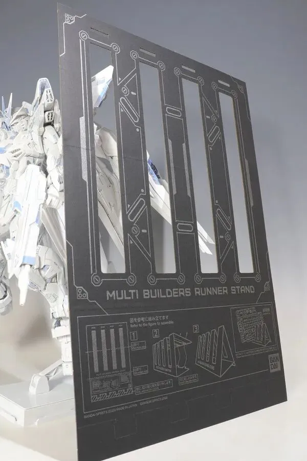 特制地台附带白色装饰片,专用连接件可直接对接背包机动翼,同时兼容通用 Action Base 支架,地台与机体的连接图能体现其安装便捷性。