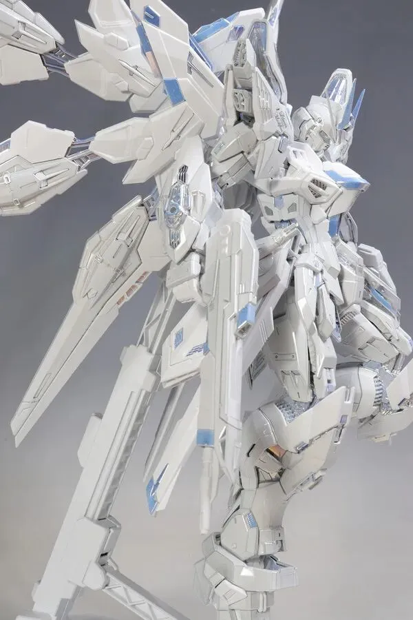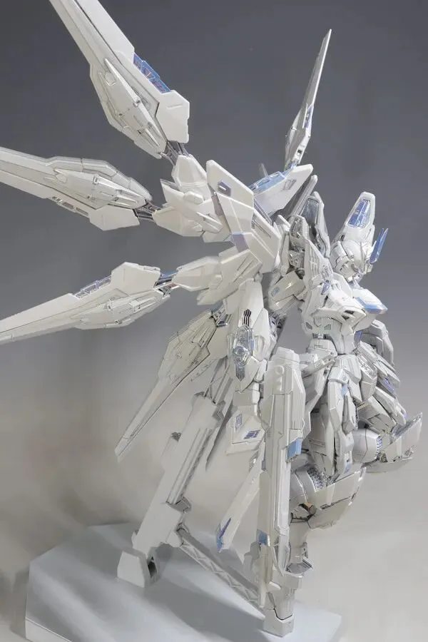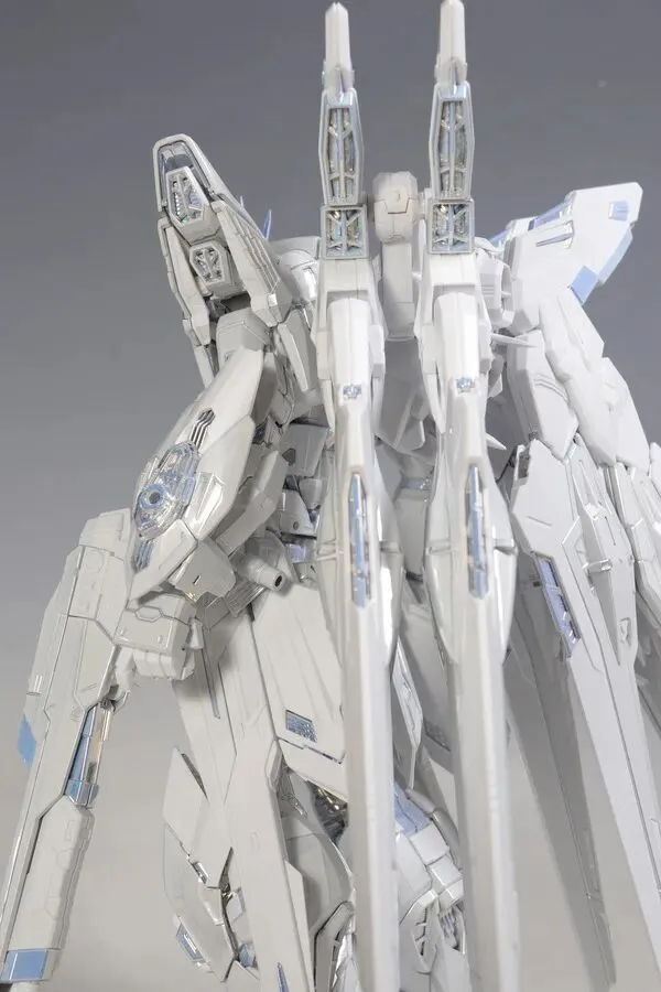 8 枚龙骑兵均可独立拆卸,翼片采用三段式展开结构,小羽根展开时的角度细节在实拍图中清晰可见;龙骑兵发射状态下,伸缩骨架会露出内部精密结构,与白色外甲形成 “内刚外柔” 的视觉反差;