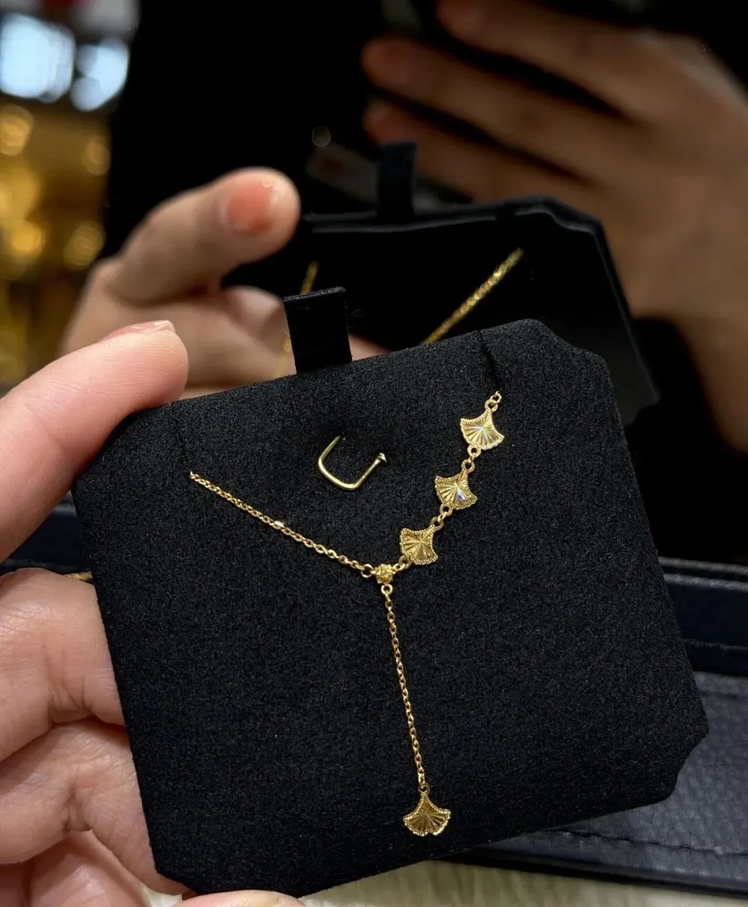 项链是那种Y型设计的 主链上有四片大小不一的银杏叶 每片叶子上都有细腻的纹路 像真的叶脉一样 最下面还垂着一片 整体看起来很灵动 妈妈拿在手里翻来覆去地看 嘴里一直念叨着太好看了 我说你试试呗 她还不好意思了 说等有客人来再戴