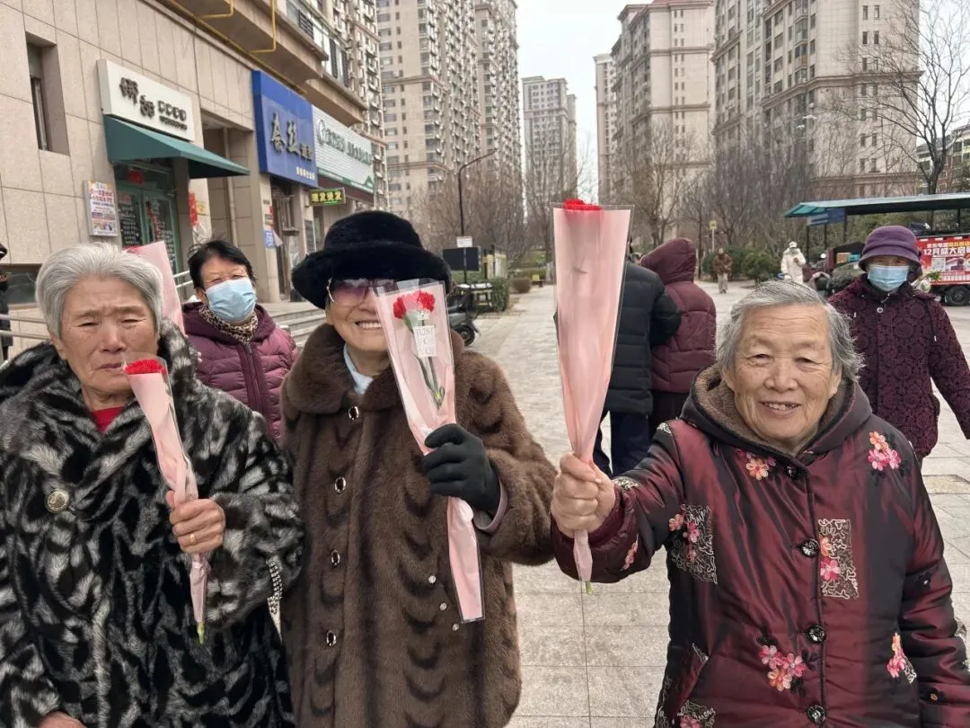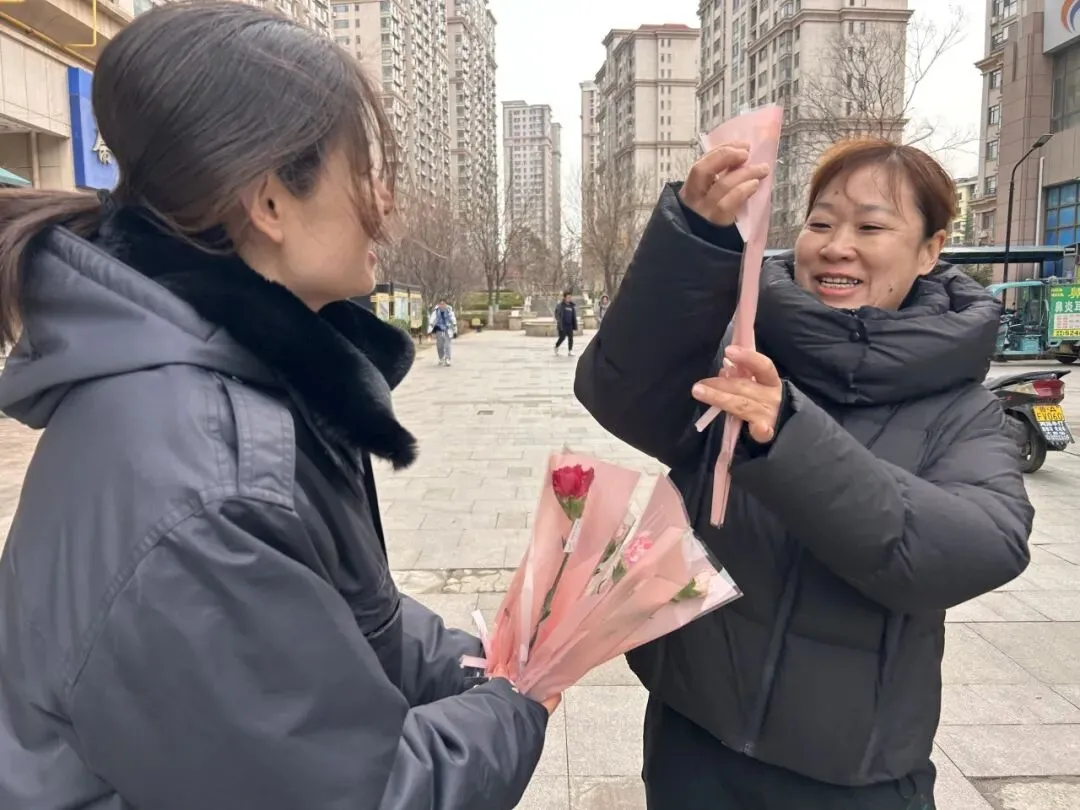 3月8日中午,物业工作人员守候在小区各大门岗、车库出口及物业服务中心,手捧一枝枝精心包装的康乃馨,为往来的女性业主送上节日的第一份惊喜与祝福。