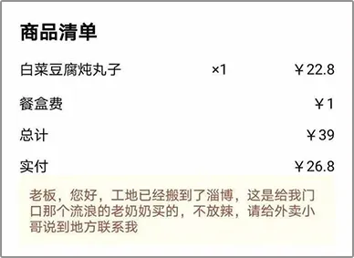 这是一个特殊的订单,一份白菜豆腐炖丸子和两个馒头,地址是济南市历城区七里堡附近一家糕点店的“门口梯子”,备注中说:“老板您好,工地已经搬到了淄博,这是给门口那个流浪的老奶奶买的,不放辣,请给外卖小哥说到地方联系我。”