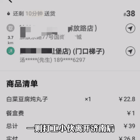 在济南打工的乔先生是一名兼职外卖骑手,平时有空闲时就会接几单。6月26日晚11点左右,他遇到了印象深刻的一个单子,深为感动。