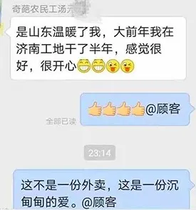 汤先生叫汤元龙,是四川人,正如他在订单备注中说的那样,5月已随着工程一起到了淄博。提到给老人订外卖这件事,汤元龙直言,这很正常,很多人都给老人送过吃的。