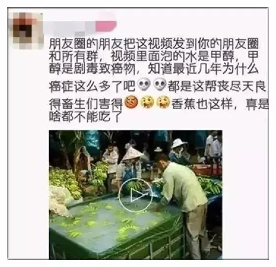 朋友圈中有人传播消息称,有商家用不明乳白色液体浸泡香蕉,疑似为甲醛。