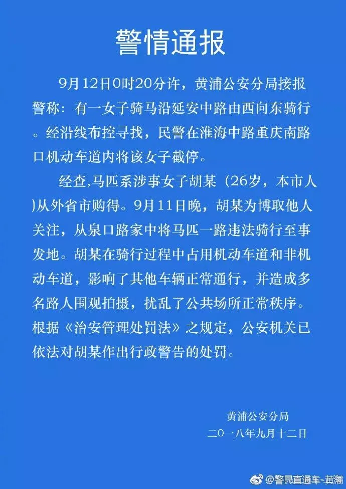 12日下午,@警民直通车-上海 发布通报称,对骑马女子胡某依法作出行政警告的处罚。