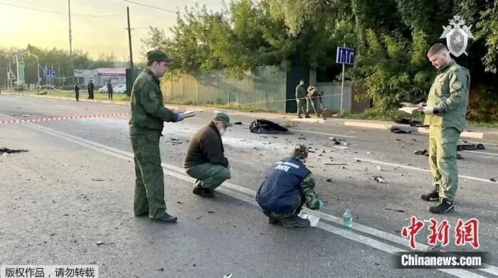 2022年8月21日,俄罗斯莫斯科地区,调查人员在汽车炸弹袭击现场工作。