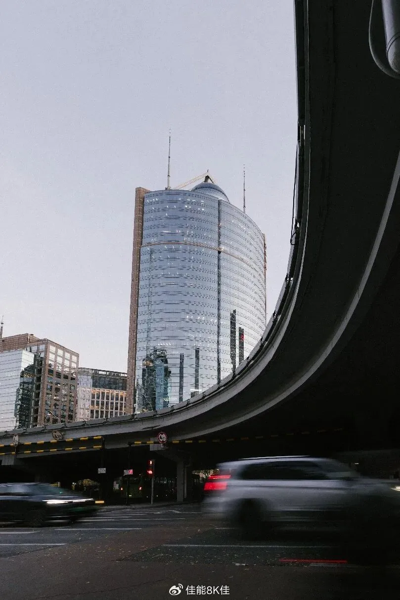 这张影像以城市高楼与高架桥的交错结构为主体,画面中弧形的高架桥自右上角延伸至画面中央,与背后的玻璃幕墙大楼形成鲜明对比。此时20mm的广角能在有限的街口位置拍下完整的建筑轮廓,并扩大前景与背景的距离感,让高架的弧线与建筑立面形成拉伸的空间结构,还能强化透视线条,使城市在视觉上显得更高、更深、更具临场感。