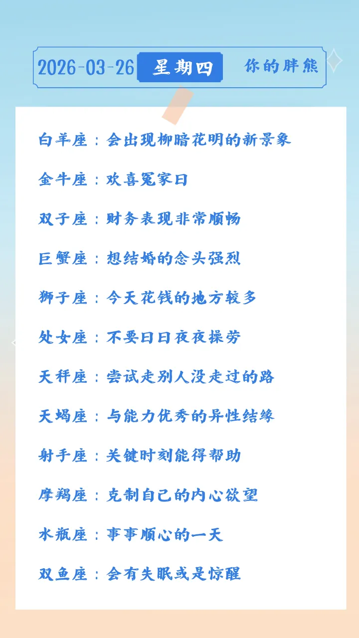 当前位置:首页>美女资讯>陈青今日星座运势2026年3月26日(图片版)