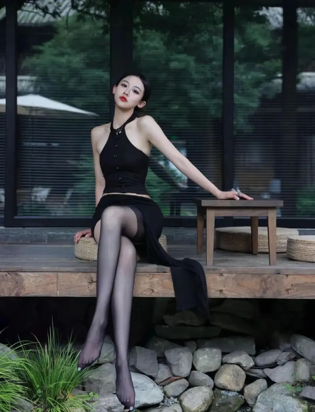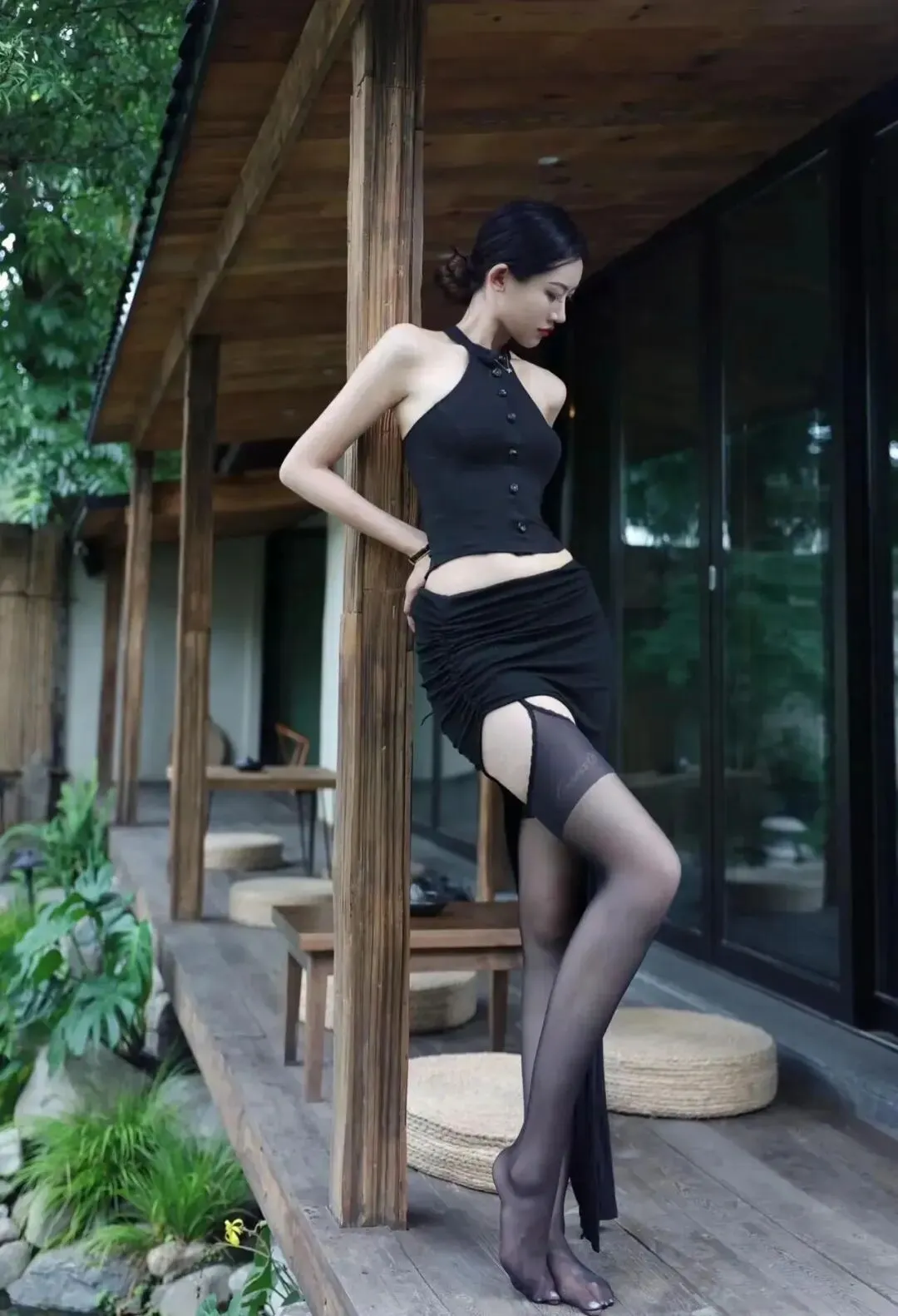 幽庭写真|木廊轻倚,黑丝薄纱释放撩人氛围