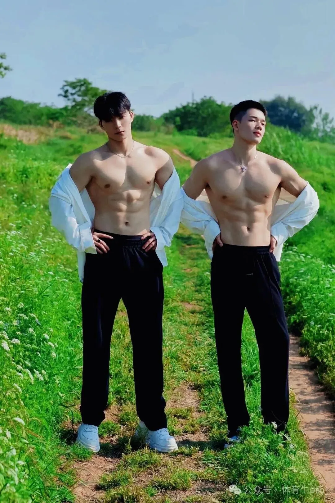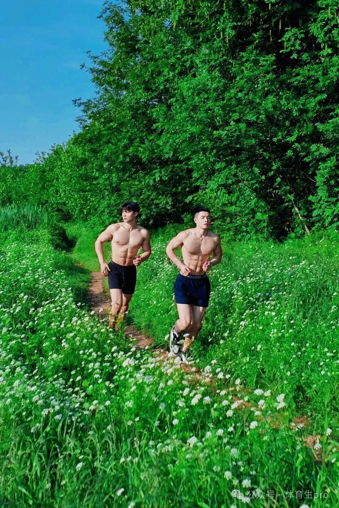 切换到草地场景,更是绝绝子!他们或双手叉腰站在小径,任阳光吻过腹肌线条;或在花丛间奔跑,短裤下的步伐写满肆意。草地上白色小花摇曳,仿佛都在为这份热烈的美好伴舞。摄影师太会抓氛围了!把男性荷尔蒙张力融在自然绿意里,随便截一帧都是视觉暴击。