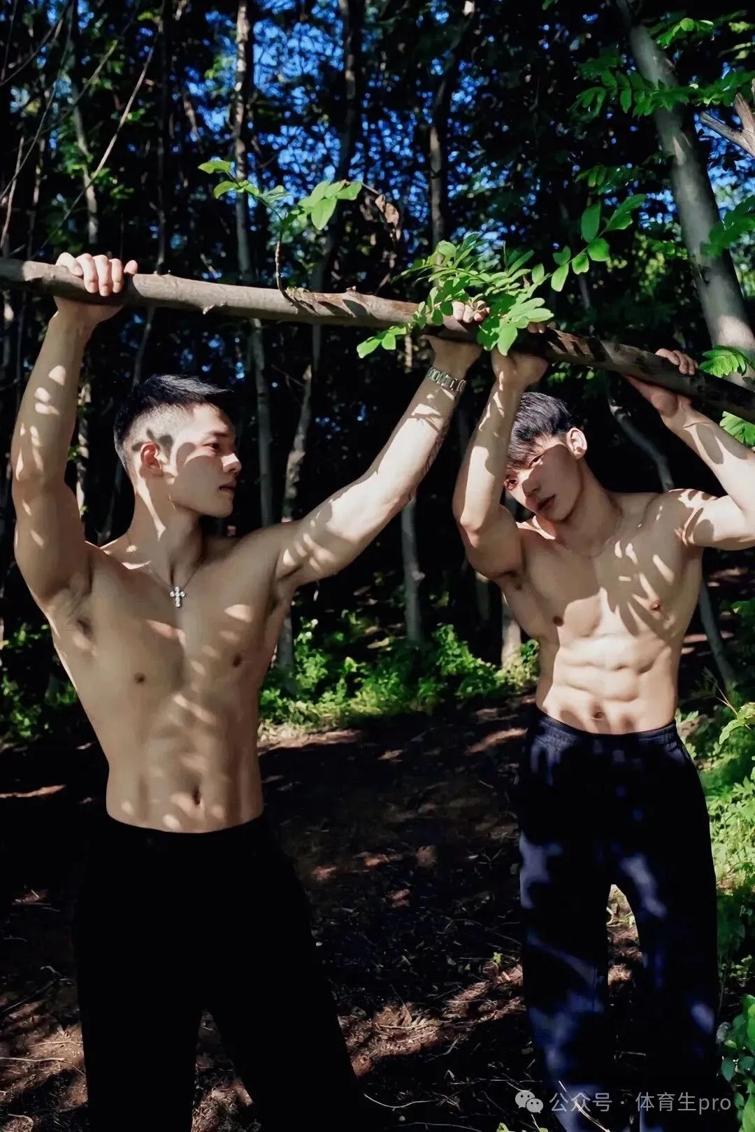 阳光穿透林间枝叶,像撒了把碎钻落在男孩腹肌上。看他们双手撑住树干,肌肉线条随动作舒展,腹肌棱角分明到犯规!那是力量美学的具象化,每一寸肌理都藏着自律密码。风卷着绿意掠过,兄弟俩并肩的身影,把青春的滚烫感直接拉满~
