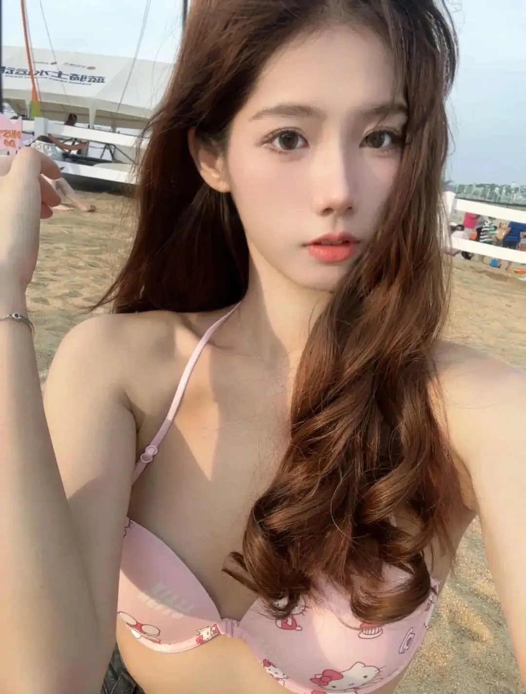 首先是穿搭上的小心机。照片里这种粉色 Hello Kitty 比基尼上衣搭配深色宽松长裤,真的是绝配。上半身亮色吸睛,突出肤色白皙,自带少女感;下半身深色收敛视觉,显瘦效果满分,还能遮挡腿部可能存在的线条不足。这种甜辣风的穿搭,既保留了夏日的清凉,又不会过于暴露,日常发朋友圈也毫无压力,属于谁穿谁好看的类型。