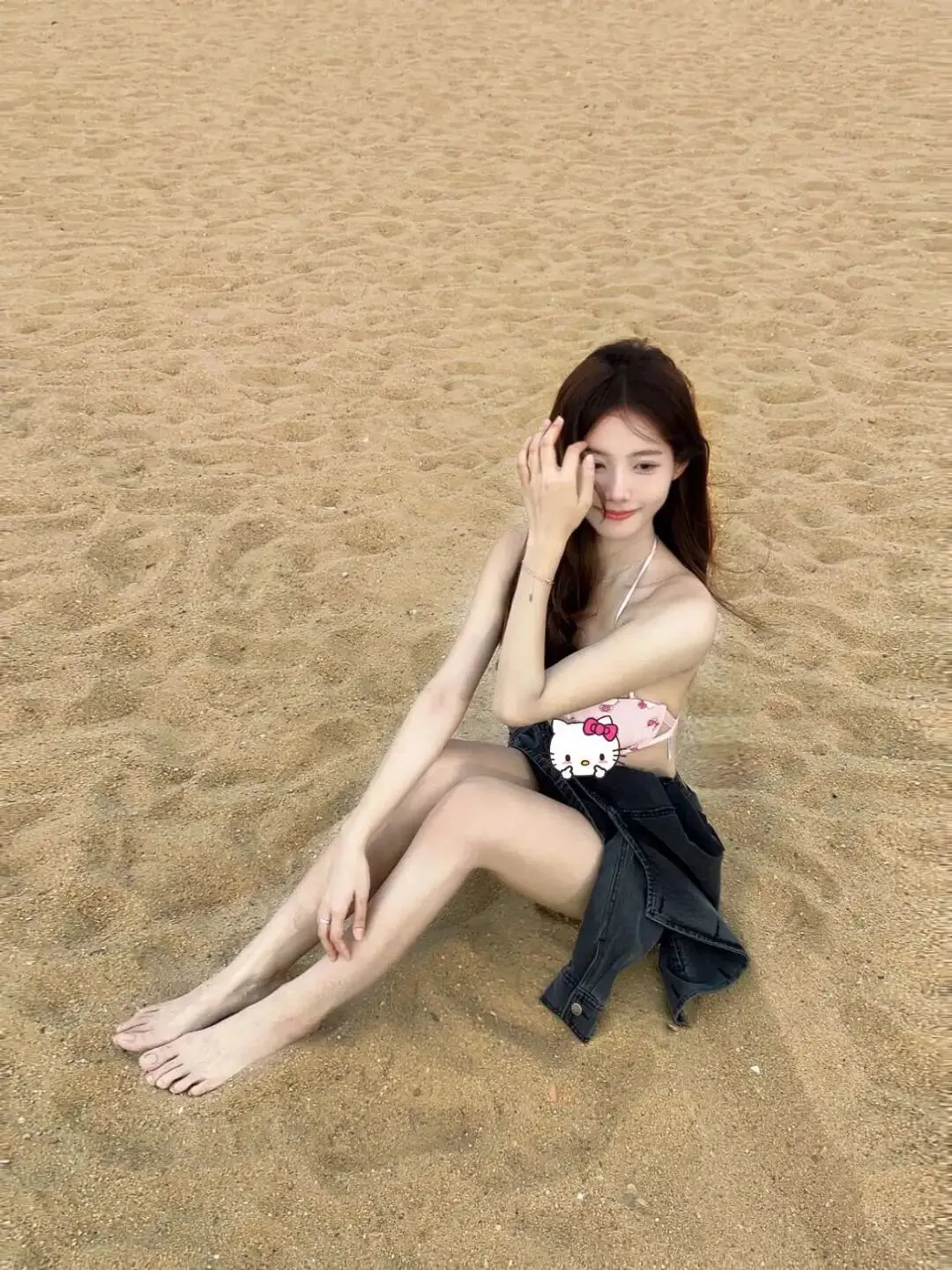 重头戏来了,坐姿是灵魂。很多女生坐在沙滩上容易驼背,或者腿缩成一团,瞬间变成小矮人。正确的打开方式是像图里这样,侧身坐,双腿自然向一侧延伸。注意脚尖要绷直,这样在视觉上能最大限度拉长腿部线条,营造出大长腿的既视感。不要正对着镜头坐,侧身三十度角,能让身体曲线更流畅,腰腹部也显得更平坦。屁股可以稍微坐实一点,大腿和小腿形成一个钝角,这样最显腿长。