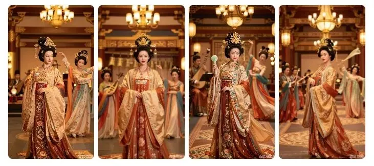 8K 画质,专业人像摄影,隋朝公主,身着华丽隋制礼服,上穿大袖襦裙,下着曳地长裙,裙身绣满缠枝花卉纹样,头戴金步摇凤冠,妆容精致(额间花钿、红唇),在隋朝宫殿内的宴饮场景,灯火璀璨,光线采用宫廷吊灯的暖金色柔光,营造华贵典雅氛围,背景有宫廷乐师、舞姬,构图遵循古典人像黄金比例,细节清晰到服饰纹理、珠宝光泽。