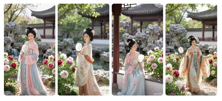 提示词:8K 画质,专业人像摄影,隋朝公主,穿着清新雅致的隋制日常襦裙,色彩以淡粉、浅蓝为主,裙摆饰有花鸟刺绣,手持团扇,在皇家园林的牡丹花丛中赏花,春日阳光透过树叶形成斑驳光影(侧逆光,突出人物轮廓与服饰质感),背景有假山、流水、亭台,整体画面清新自然,捕捉公主赏花时的温婉神态,细节展现服饰褶皱、花卉细节。