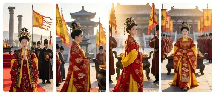 提示词:8K 画质,专业人像摄影,隋朝公主,身着庄重的隋制祭祀礼服,服饰以朱红、明黄为主色调,配有繁复的云纹刺绣,头戴象征身份的礼冠,在郊外祭坛前祈福,光线为清晨的柔和阳光(顺光,照亮人物与祭祀场景),背景有祭坛、旌旗、侍从,营造庄严肃穆的氛围,清晰呈现服饰的庄重感与祭祀场景的细节。