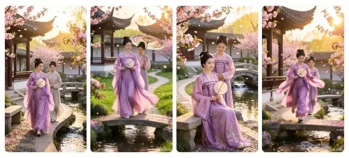 8K 高清,古风人像摄影,隋朝相府小姐在春日西园庭院踏青。身着粉紫色齐胸襦裙,轻盈飘逸,刺绣精美。场景为繁花似锦的花园,桃花、海棠盛开,小桥流水、亭台曲径。光线为温暖黄金时刻阳光,侧逆光营造唯美光晕。人物姿态活泼,轻提裙摆漫步,手持团扇,身后有侍女随行。画面色彩柔美,细节到花瓣、露珠、衣袂飘动,充满春日生机与贵气。