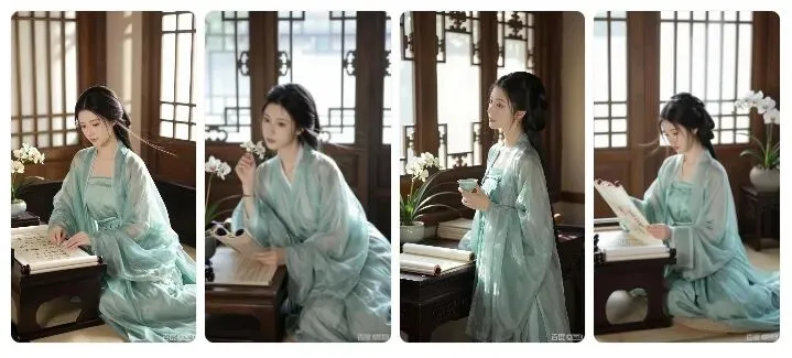 8K 超写实,专业人像摄影,古风构图,一位隋朝相府小姐,身处精致闺房书斋。身着素雅的青色襦裙,外罩薄纱披帛,衣纹轻柔雅致。场景为木格窗、书案、卷轴画、盆栽兰花。光线为早晨柔和自然光,窗影斑驳,侧光勾勒面部轮廓。人物坐姿优雅,手持书卷,神情温婉娴静。画面细节极致,发丝清晰,衣料质感通透。整体氛围宁静、雅致、书卷气十足。