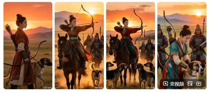 8K 电影级画质,专业古风摄影,隋朝相府小姐在郊外原野进行围猎活动。身着胡服骑射改良装,窄袖短袄,腰间束带,脚登软靴,英气十足。场景为开阔草原、远山、猎场,有猎犬、弓箭及随行护卫。光线为傍晚暖橙余晖,逆光勾勒人物剪影与轮廓。人物侧身持弓,神情从容自信,既有世家小姐的优雅,又有飒爽英姿。画面景深极佳,背景虚化,主体突出,动静结合,充满力量与美感。