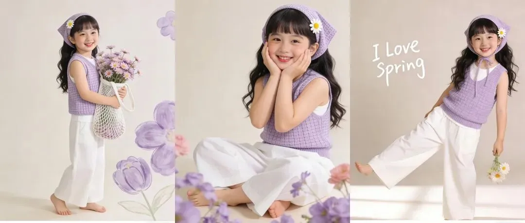 帮我生成 4 张 3:4 真人写真,8 岁东亚小女孩,严格保留原图五官脸型,面部无扭曲、无 AI 失真;气质温柔活泼,表情甜美灵动(微笑 / 托脸 / 俏皮抬腿),眼神明亮清澈。发型:黑色长卷发 + 齐刘海,搭配浅紫色针织三角巾发带(饰白色小雏菊 + 黄色花蕊),发丝蓬松柔软;妆容:清透元气妆,橘粉元气腮红 + 淡粉唇釉,暖调奶油肌,肤质细腻无浓妆;服饰:香芋紫华夫格针织无袖背心(内搭白色打底)+ 宽松白色阔腿长裤,赤脚,清新舒适。场景:纯白 / 浅米色纯色背景,明亮干净,点缀手绘紫花、小雏菊及英文贴纸(I Love Spring/Spring flower),贴纸置于空白处不覆盖人物;道具:插满粉紫小雏菊的白色网兜手提袋,散落同色系郁金香等花朵。光影:柔和暖调顶 / 侧光,面部均匀明亮,淡紫清新氛围,带轻微胶片颗粒感,质感细腻;风格:紫色系春日小清新儿童写真,韩系温柔风,商业级精修,8K 高清。分构图1. 全身抱花侧站:侧站抱网兜花束,背景手绘紫花,暖光展示整体造型2. 特写托脸浅笑:双手托脸微笑,前景点缀粉紫花,暖光突出面部与发带3. 半身俏皮抬腿:单手持花单腿抬起,背景配手绘贴纸,侧光凸显灵动4. 局部花与发带:特写粉紫花、网兜袋与发带,暖光展现春日质感负面提示模糊,五官变形,皮肤粗糙,妆容脏污,服饰褶皱杂乱,背景杂乱,强光刺眼,色彩过艳,水印,无关文字,多余道具,人物比例失调,发丝凌乱,面部过曝,贴纸覆盖人物,道具 / 发饰变形。
