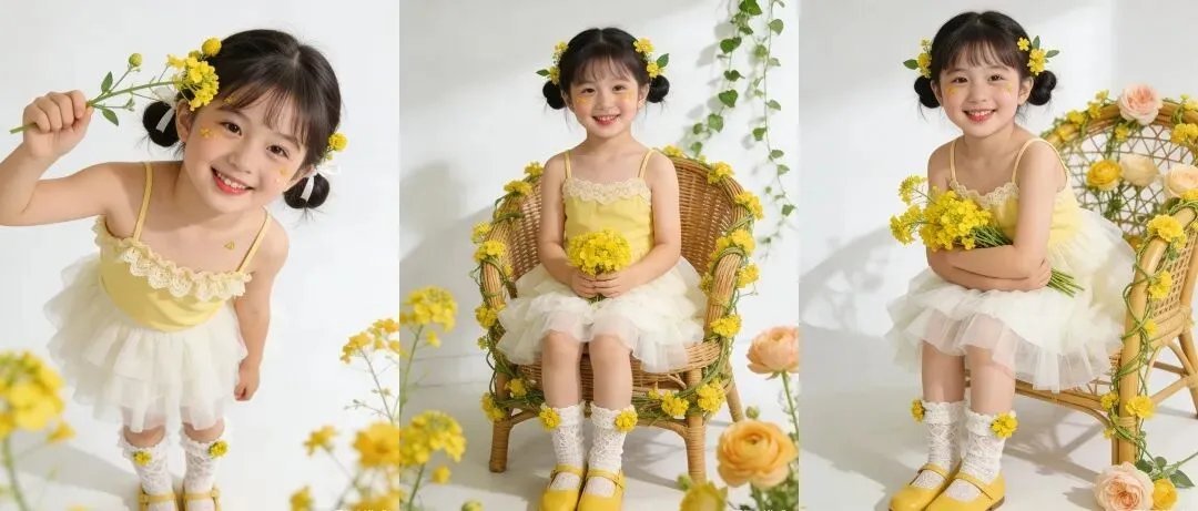 帮我生成3张3:4真人写真,8岁东亚小女孩,严格保留原图五官,面部自然,软萌灵动,甜美治愈。发型:绑两个低的丸子头,发间点缀油菜花的小花+小绿叶,胎毛刘海,发丝蓬松。妆容:清透元气妆,眼下黄花亮片,脸颊金箔花瓣,橘色腮红+粉橘唇釉,暖调奶油肌。服饰:鹅黄细肩带吊带(蕾丝花边)+奶白蛋糕纱裙,白蕾丝堆堆袜(袜口别油菜花),鹅黄小皮鞋。场景:室内白背景,缠黄花藤编椅,油菜花/洋牡丹,春日治愈感。光影:柔和暖侧光,皮肤通透,轻微胶片颗粒。风格:韩系清新儿童写真,商业精修,8K高清,真实自然。构图:1.  特写:举花歪头看镜头,前景油菜花2.  全身:坐藤椅捧油菜花,背景绿藤蔓3.  半身:抱油菜花甜笑,背景洋牡丹负面提示:模糊,五官变形,皮肤假滑,磨皮过度,AI感重,不真实,背景虚假,色彩过艳,服饰僵硬,发丝僵硬,水印,文字,比例失调,过曝。