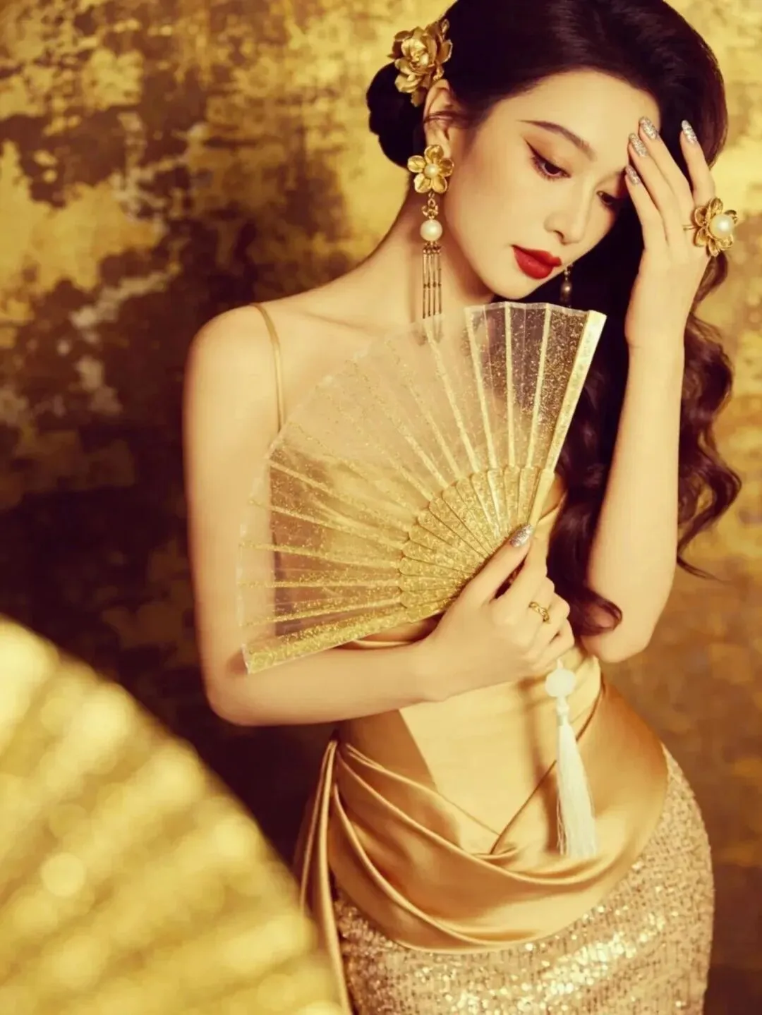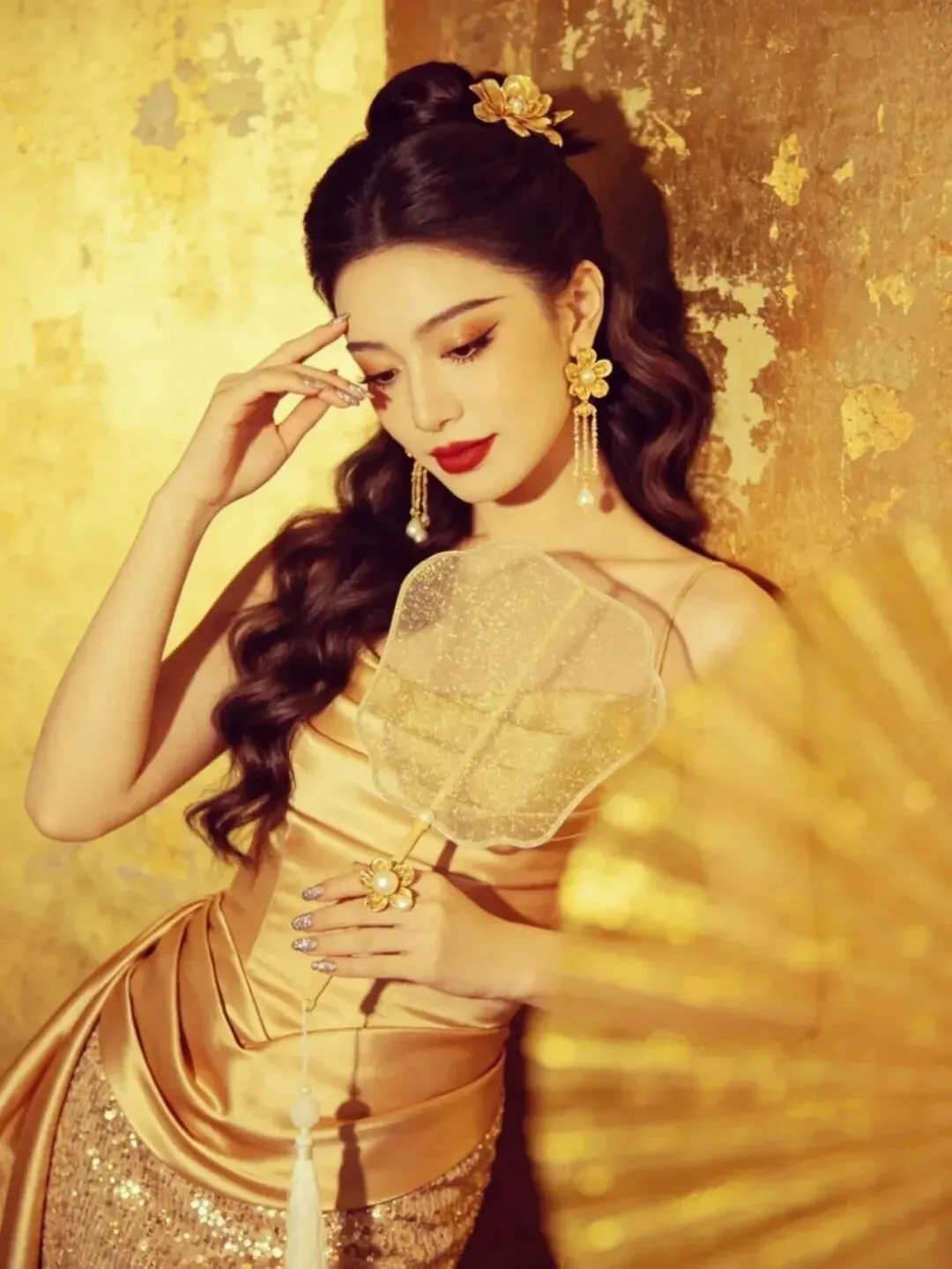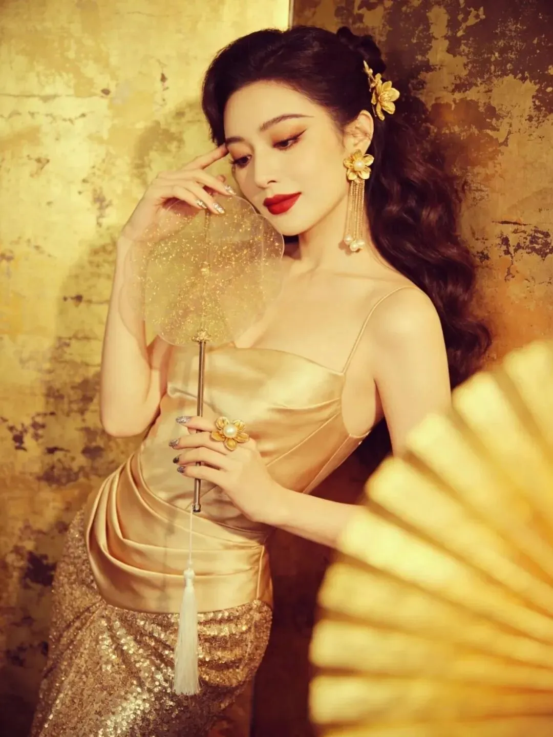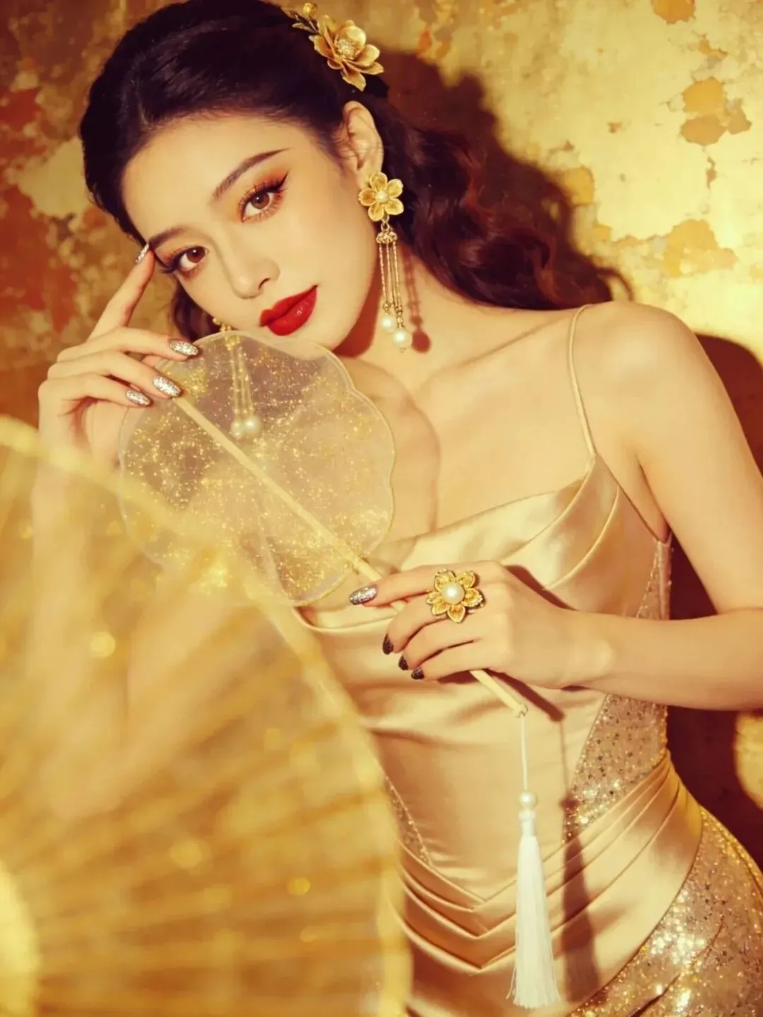 右手拿着折扇靠在肩侧,左手轻触额头,头微微低下看向下方。折扇的流苏自然垂落,和卷发的弧度形成呼应,金裙的褶皱设计在光影下更有质感,整个人透着慵懒又复古的氛围。